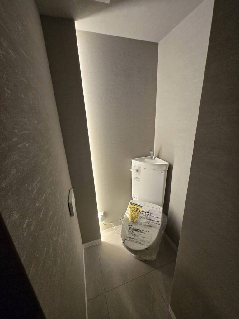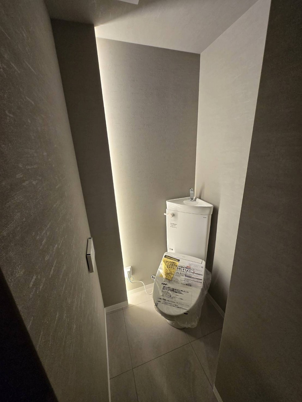 トイレは梁と間接照明を活かし小ささを感じさせない空間に。